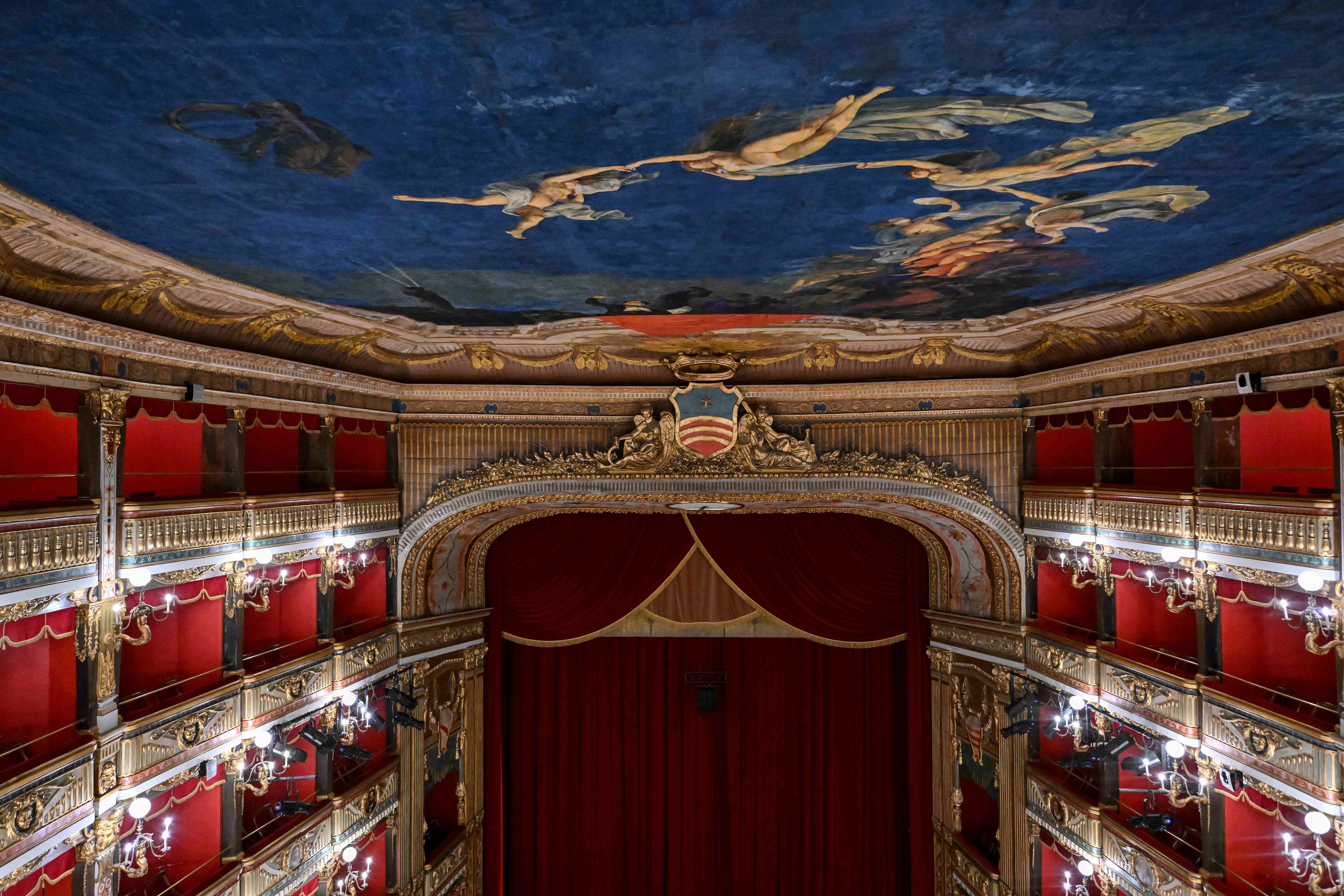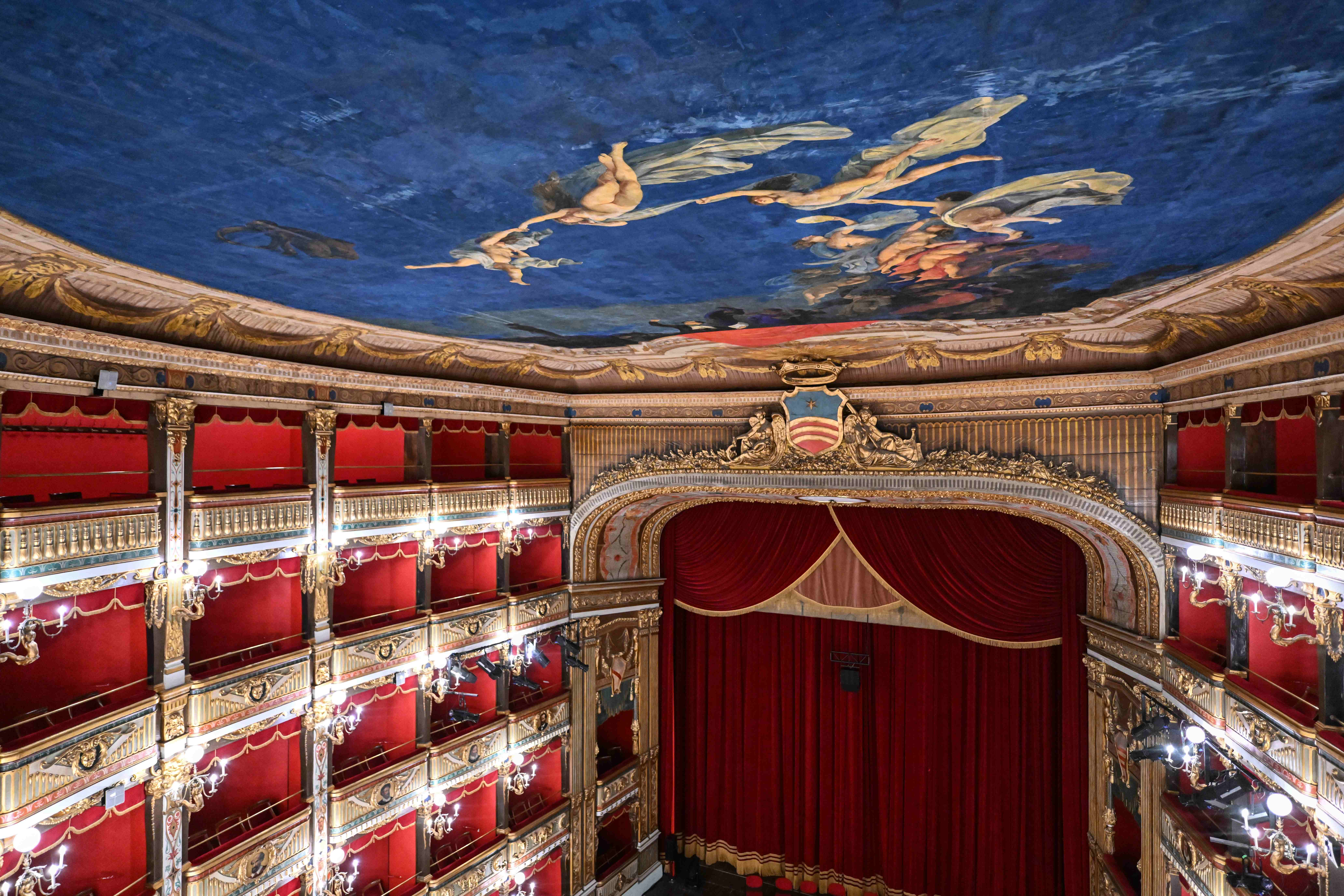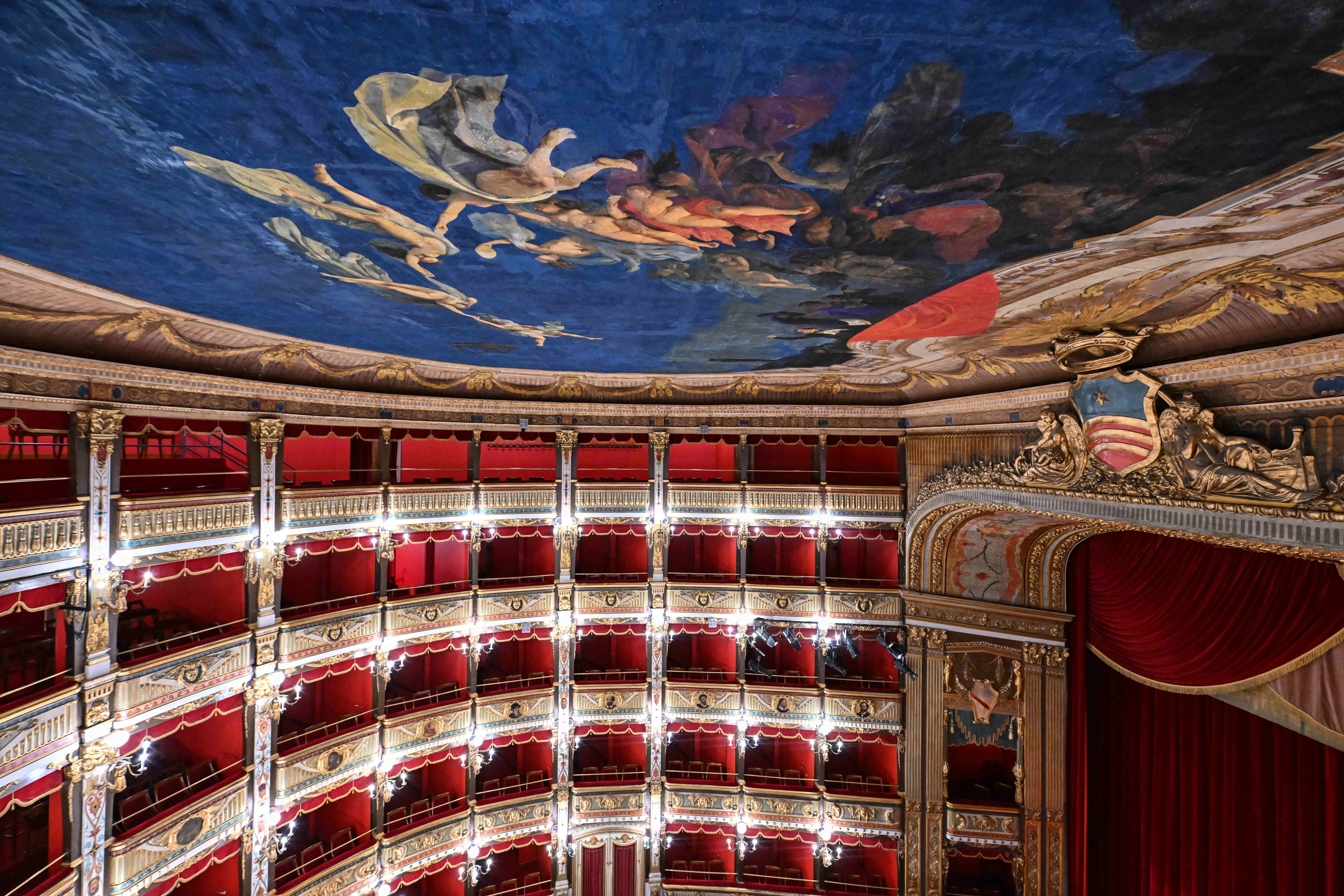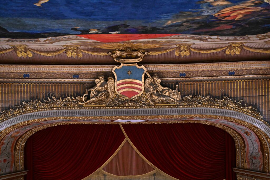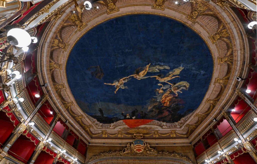 If Di Criscito’s sky represents the consecration of the hall to the great season of Italian melodrama, the curtain is entrusted with celebrating the history of the city by evoking a glorious episode from the past.