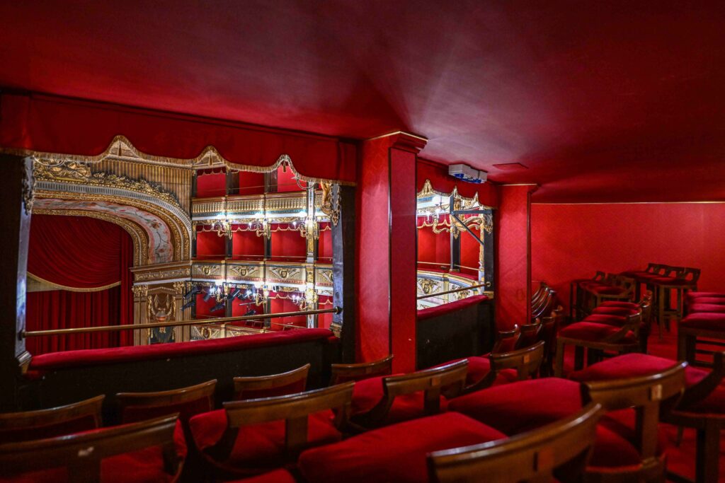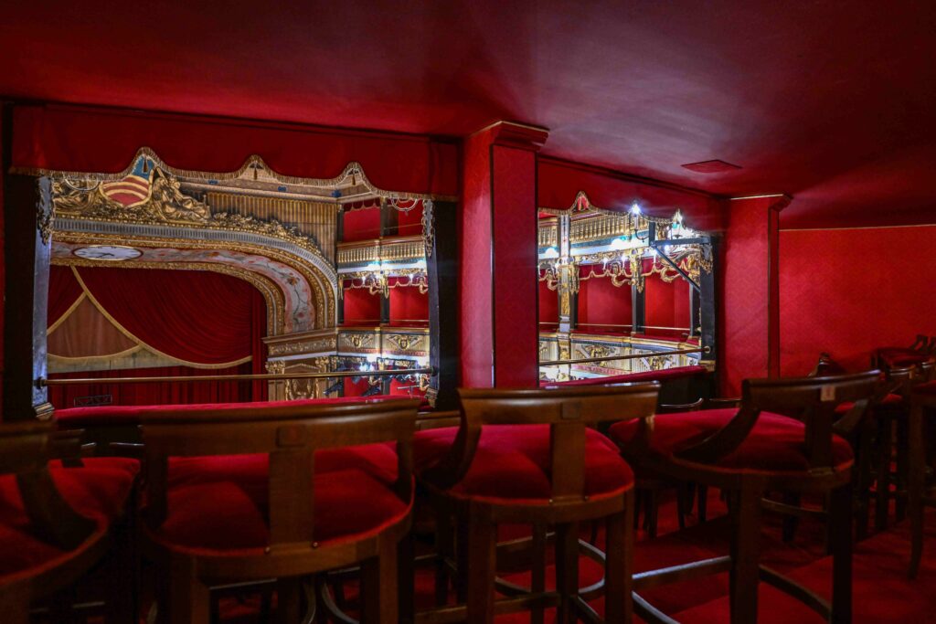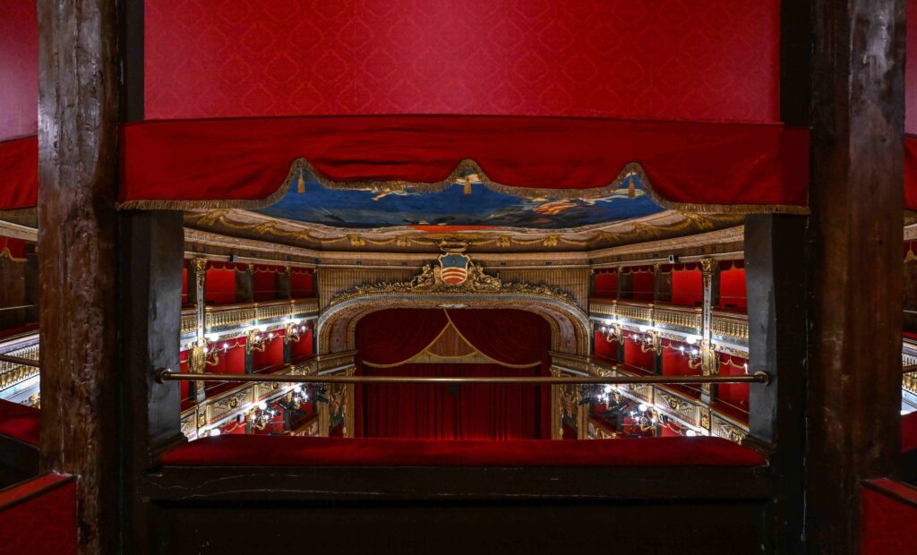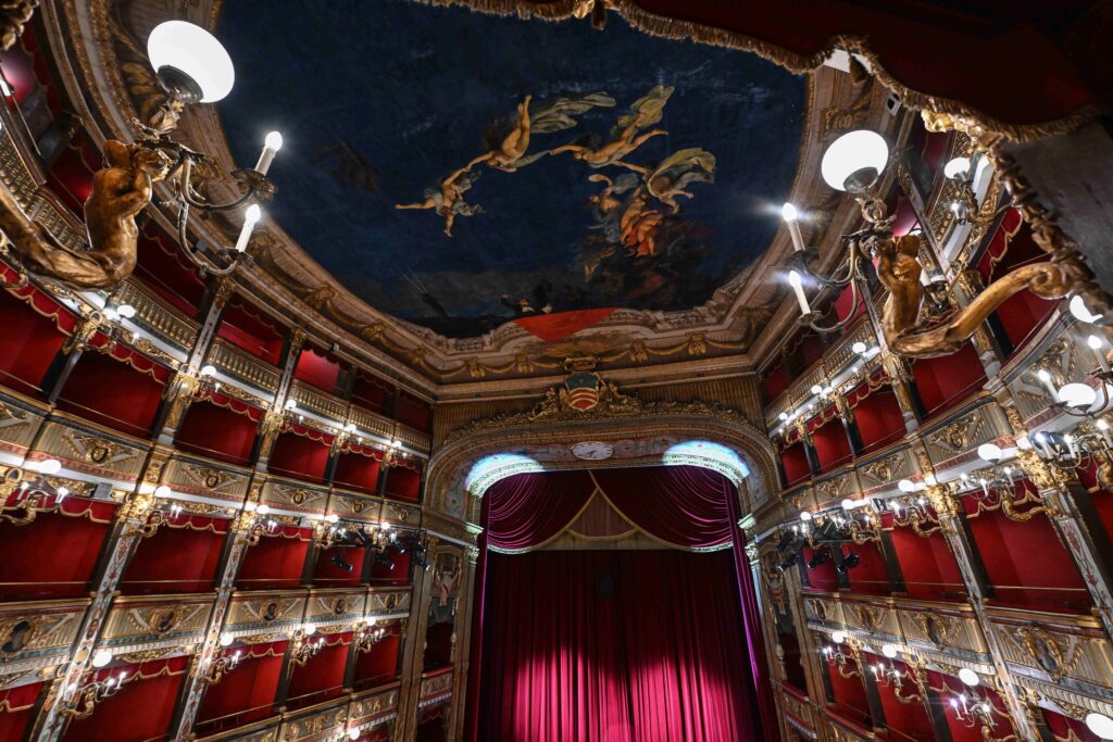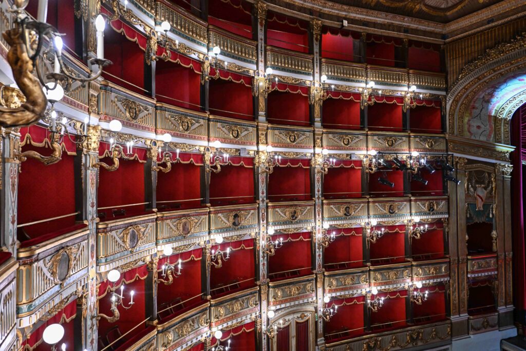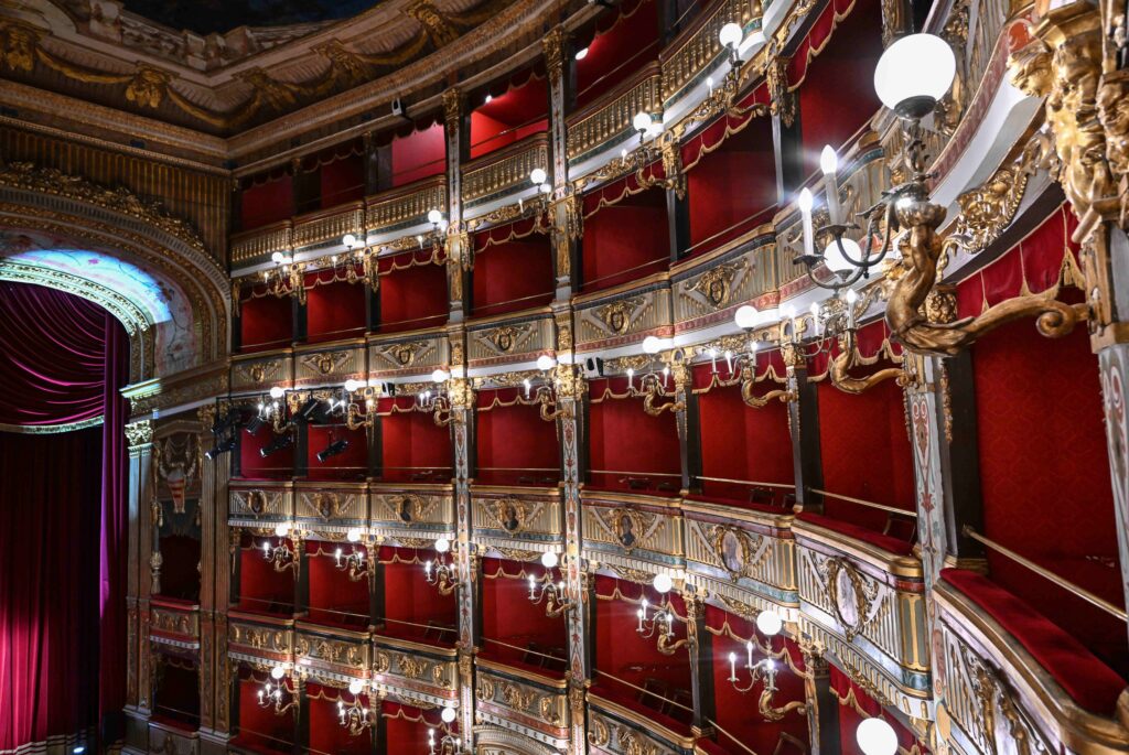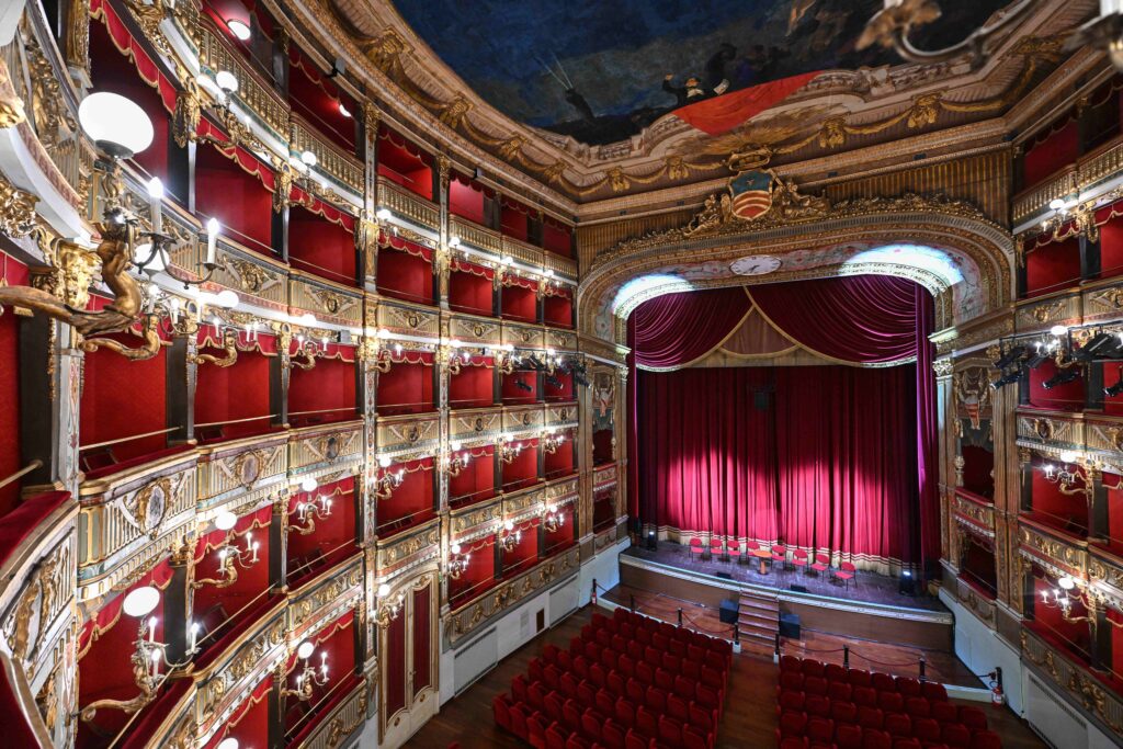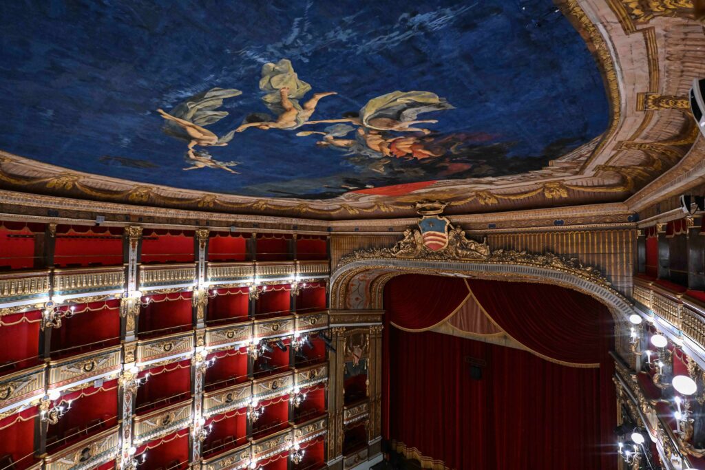 The design and supervision of the works were entrusted to architects Antonio D’Amora and Giuseppe Manichini, who based themselves on the measurements and proportions of the San Carlo Theatre in Naples.