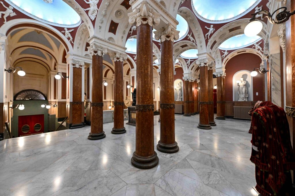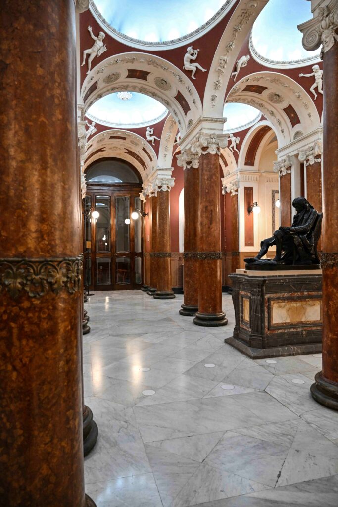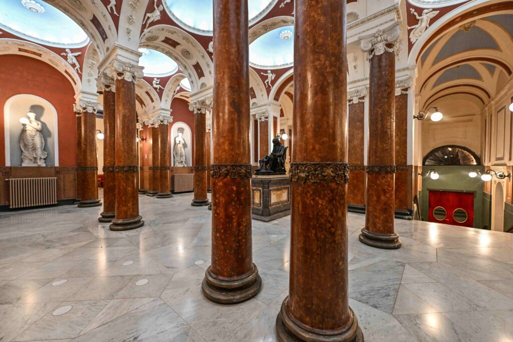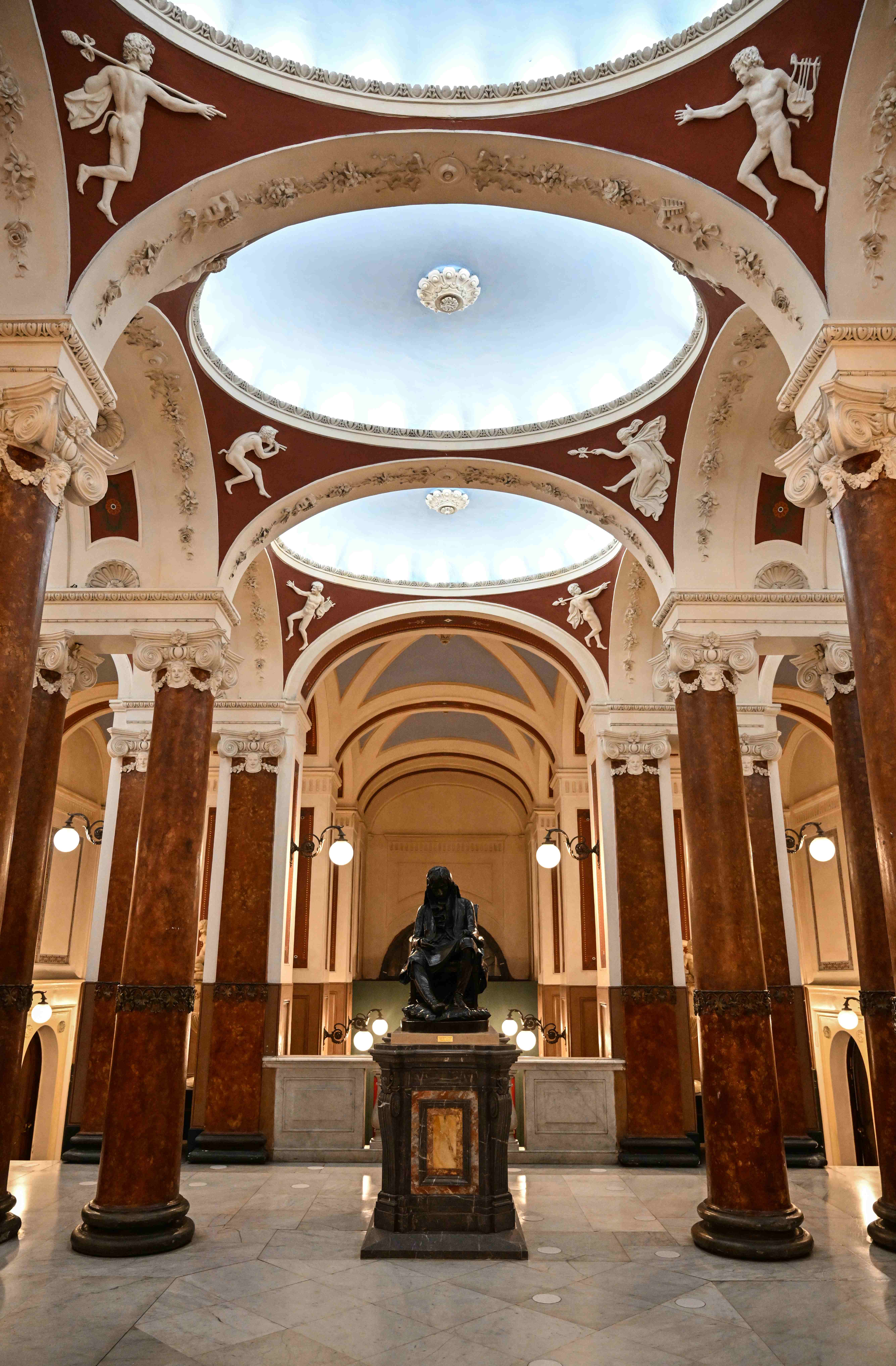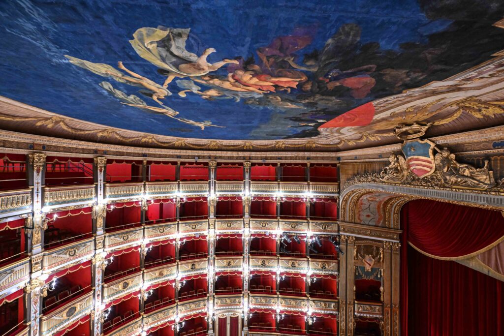 From the foyer onwards, the iconographic programme is defined with great clarity: the chosen images had to convey the intended use of the place, conceived as a temple of music and, in particular, of the tradition of bel canto.