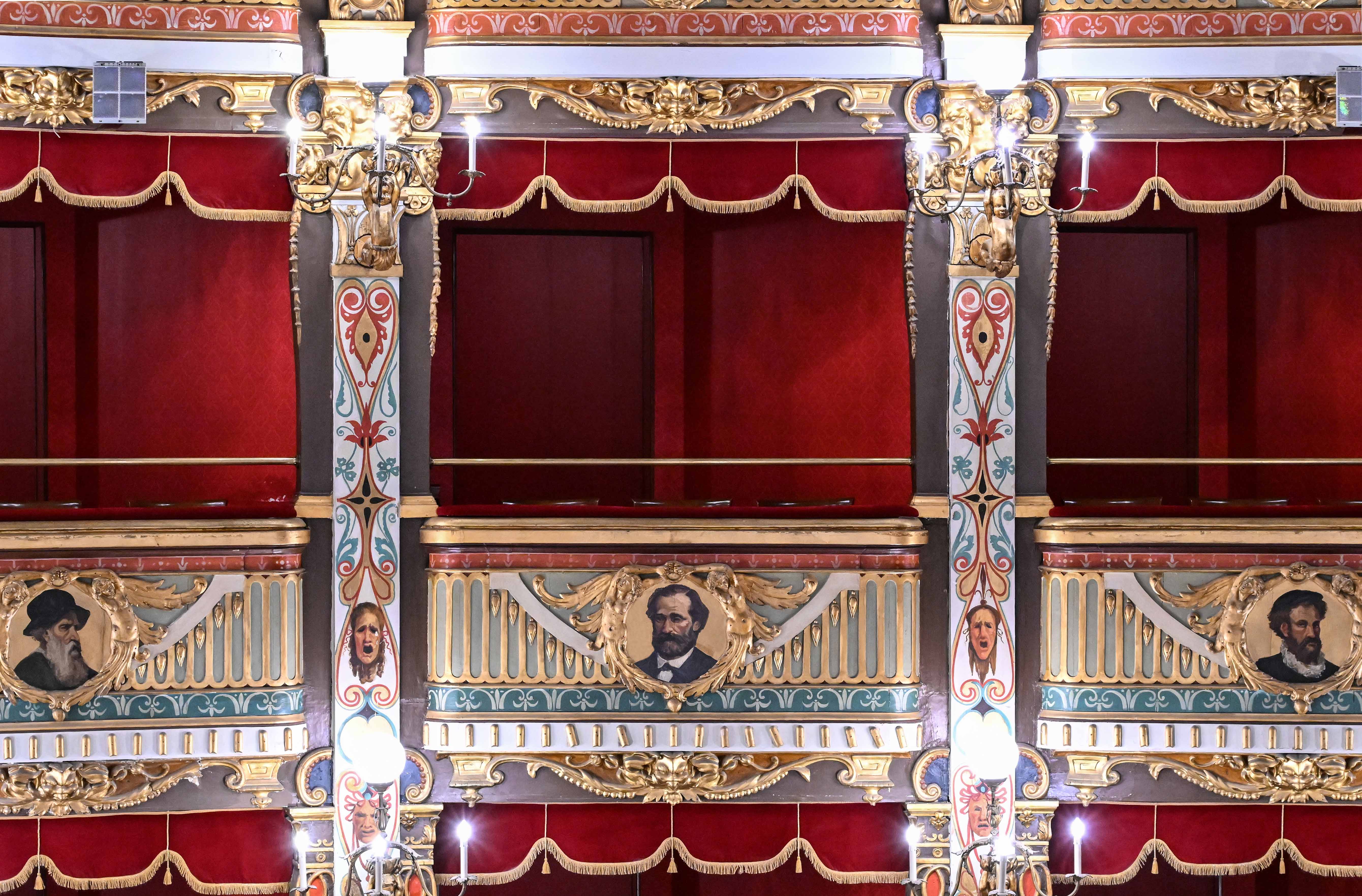 In these medallions, from right to left as you enter the hall, are depicted: Vincenzo Bellini, Domenico Cimarosa, Giovan Battista Pergolesi, Carlo Goldoni, Gioachino Rossini, Gaetano Donizetti, Vittorio Alfieri, Torquato Tasso, Dante Alighieri, Michelangelo Buonarroti, Raphael, Giotto, Leonardo da Vinci, Andrea Sabatini, Benvenuto Cellini, Salvator Rosa and Giuseppe Verdi.