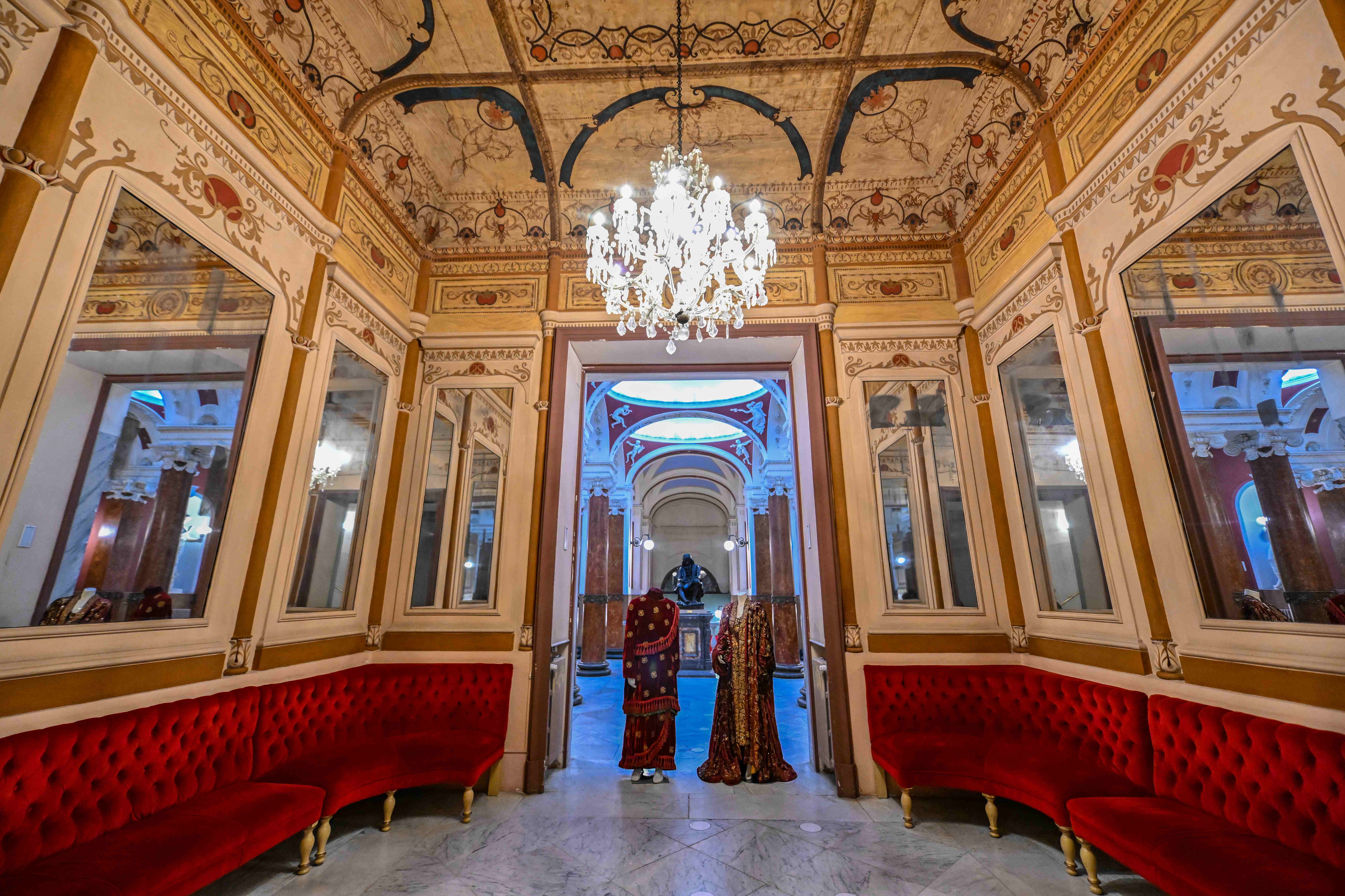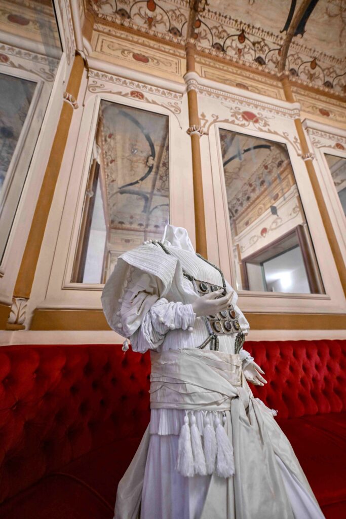 Its elegant yellow and blue medallions are perfectly balanced with the historical scene, constructed through a skilful blend of grand operatic choreography and exotic oriental touches reminiscent of Mariano Fortuny.