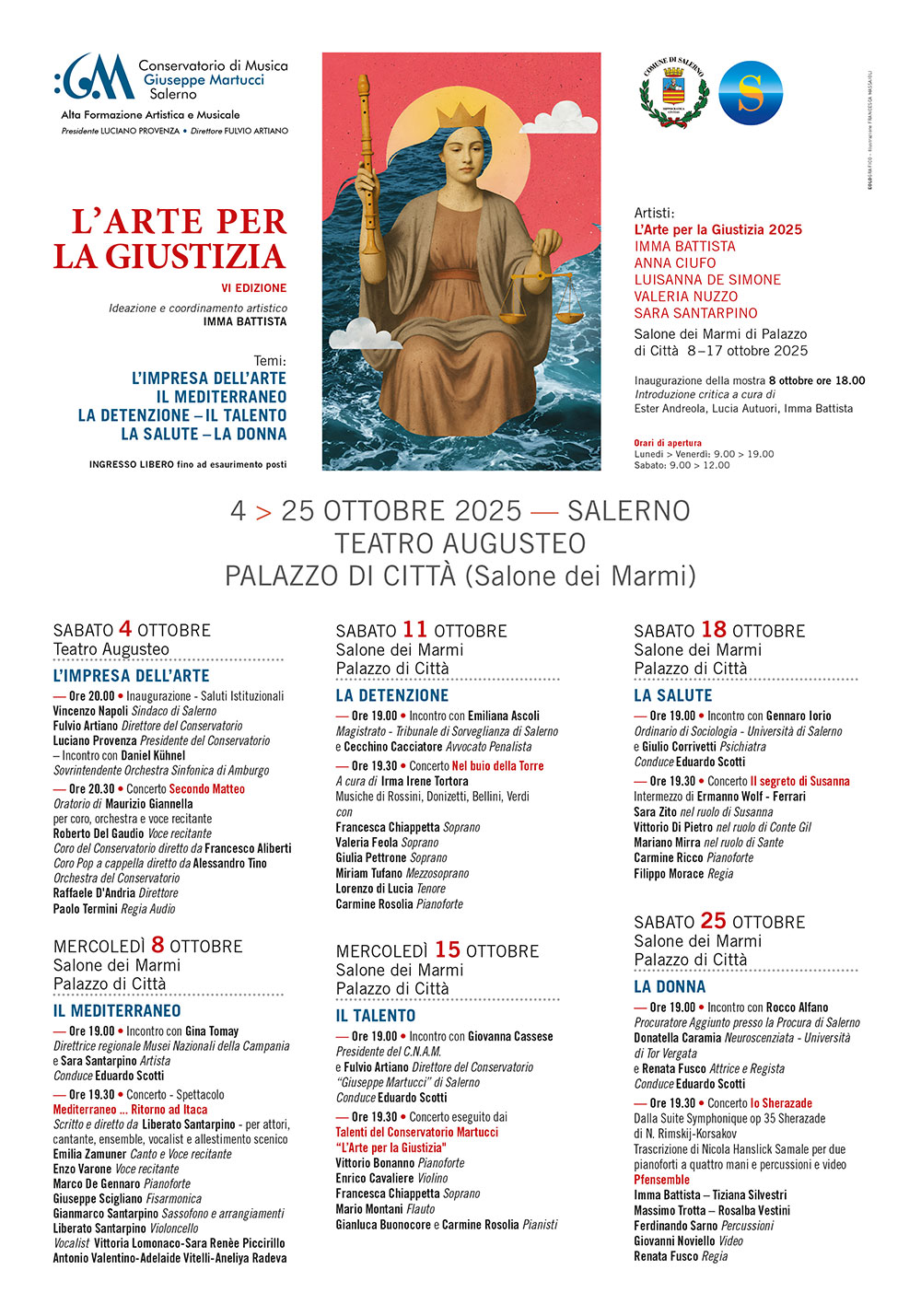 Dal 4 al 25 ottobre 2025 si svolgerà la sesta edizione de L’Arte per la Giustizia, progetto artistico e culturale organizzato dal Conservatorio di Musica “Giuseppe Martucci” di Salerno, con il sostegno dell’Amministrazione Comunale di Salerno.