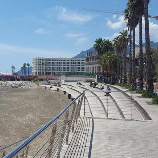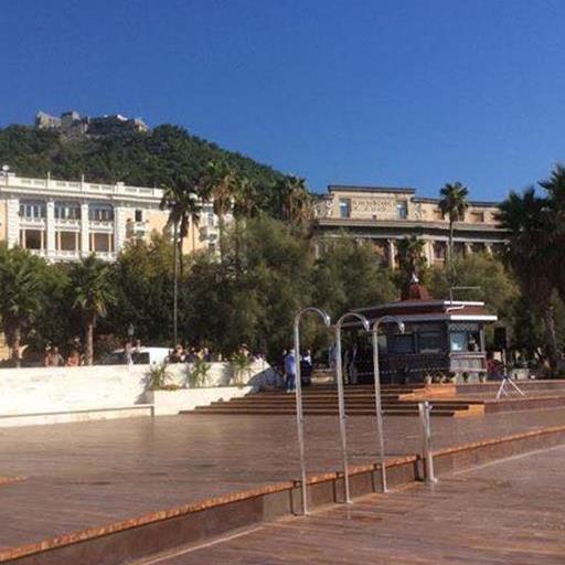 Un assito di teack, delle palme, una serie di rampe e di scale che vanno verso l’arenile caratterizzano l’impianto dell’intervento progettato da Carlo Cuomo e Associati. Solarium, luogo di sosta, ma anche luogo di piccoli spettacoli e area giochi grazie al piccolo anfiteatro che sorge sul lato verso il porto turistico e la Piazza della Libertà.
