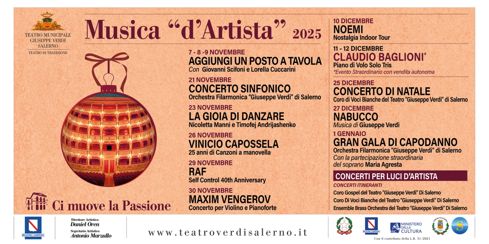 Musica d’artista arricchirà anche il cartellone operistico aggiungendo alla ricca programmazione una data extra fuori abbonamento di Nabucco, il 27 dicembre. Nabucco è l'opera con cui Verdi entra nella storia, riscuotendo fin dalla prima rappresentazione un successo enorme, con il suo potente affresco musicale in cui due popoli contrapposti, l'uno dominatore (quello degli Assiri), l'altro oppresso (quello degli Ebrei), rievocano al popolo italiano drammatiche circostanze della sua storia risorgimentale. In pochi anni fu data non solo in tutti i teatri italiani, ma in Europa e all’estero. La sensibilità narrativa di Plamen Kartaloff curerà la regia dell’allestimento. Dal podio Daniel Oren dirigerà l’Orchestra Filarmonica Salernitana “Giuseppe Verdi” di Salerno. Il M° Francesco Aliberti guiderà il Coro dell’Opera del Teatro di Salerno. In scena alcune delle migliori voci del panorama internazionale: Amartuvshin Enkhbat, baritono dal canto tornito ed impeccabile, Fabio Sartori, tenore che possiede uno strumento vocale caldo e accattivante; e una strepitosa e magnifica Ekaterina Semenchuck riconosciuta per essere uno dei soprani più importanti al mondo.